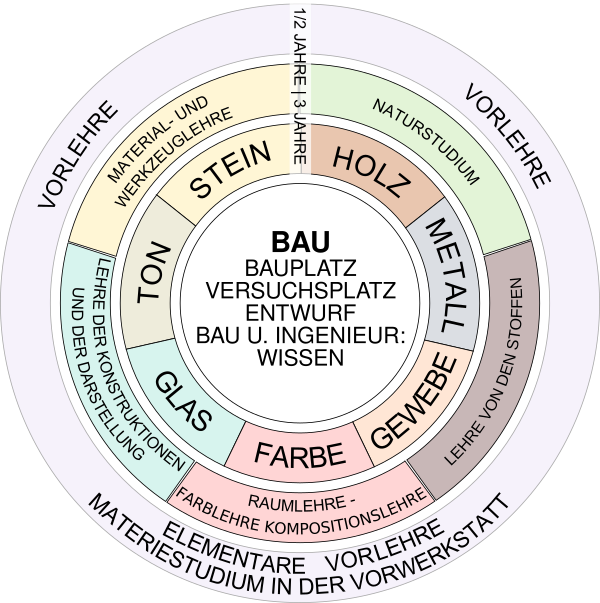 После вводного курса студенты осваивали «натурные штудии», «композиционные уроки цвето-пространства», «уроки конструкции и изображения», «ткачество», «уроки материала и инструментария» (Werkzeuglehre). Ремесленные мастерские второго-третьего годов обучения назывались: «Текстиль», «Краска», «Глина», «Камень», «Стекло», «Дерево», «Металл». В конечном итоге все предметы соединялись в «проектировании», «строительном и инженерном умении» (Bau und Ingenieurwissen).