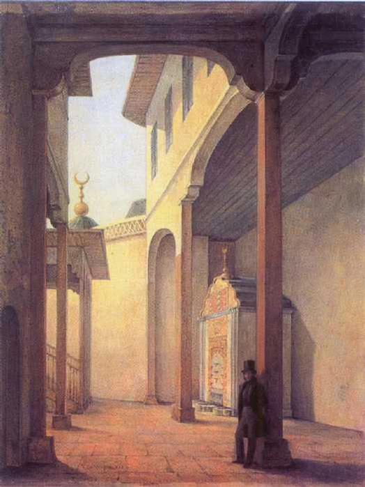 В Бахчисарай приехал я больной. Я прежде слыхал о странном памятнике влюблённого хана. К** поэтически описывала мне его, называя la fontaine des larmes. Вошед во дворец, увидел я испорченный фонтан; из заржавой железной трубки по каплям падала вода. Я обошёл дворец с большой досадою на небрежение, в котором он истлевает, и на полуевропейские переделки некоторых комнат. NN почти насильно повёл меня по ветхой лестнице в развалины гарема и на ханское кладбище.