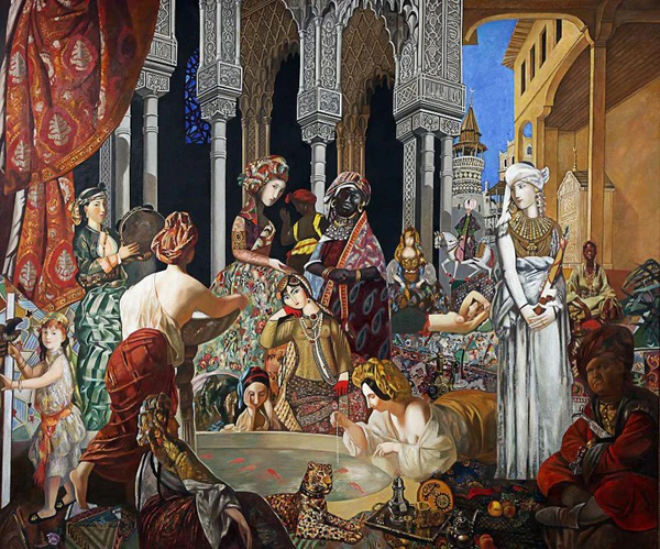 Композиция картины основана на мотиве из «Бахчисарайского фонтана», причём часть персонажей и их расположение сохранены без изменений. На заднем плане позади основных фигур изображены женские персонажи, а справа — негритянка, заимствованная из произведения И. Репина. Слева размещены девочка с ястребом в правой руке и женщина с бубном, выше которых видна драпировка. В верхней части картины слева изображена аркада из дворца Комарес в Альгамбре, а справа — внутренний двор Бахчисарайского дворца с фонтаном.