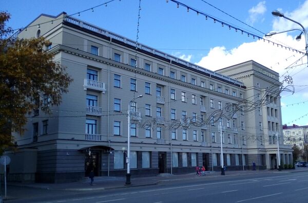 Кирпичное здание гостиницы построено в форме буквы D. Здание шестиэтажное с балюстрадой, оштукатурено, межэтажный карнизы на уровне второго и четвёртого этажей, имеет сгруппированные лоджии. Венчающий карниз углового корпуса с сухариками. Парадный вход с колоннами устроен со стороны улицы Ленина. Первый этаж с лопатками, второй и третий этажи рустованы. Имеет замкнутый внутренний двор.