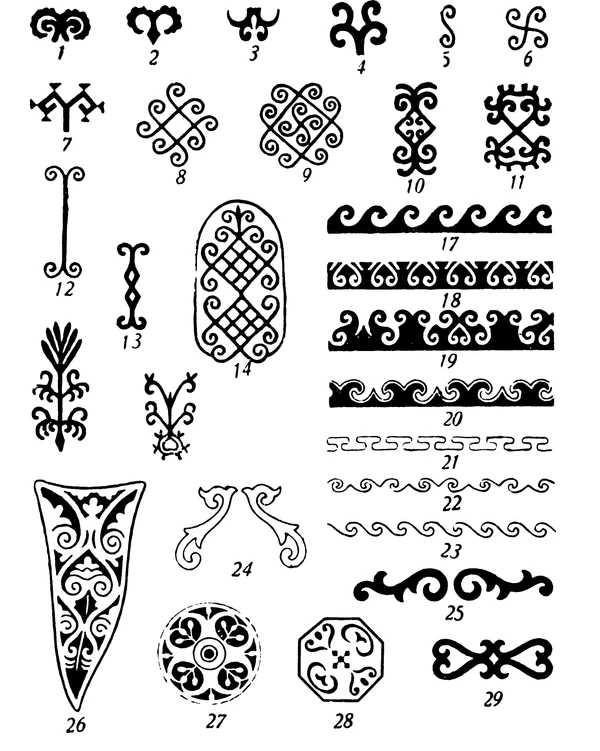 - Геральдические композиции из птиц, животных и деревьев, восьмиконечные звезды, бордюрные узоры из вилообразных, ногтевидных и V-образных фигур.
