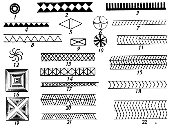 - Простые геометрические фигуры в виде треугольников, квадратов и четырёхугольников, зигзагов, крестов ×, ромбов, кругов Ο, вихревых розеток — входят в состав сложных орнаментальных узоров в форме бордюра или розетки.