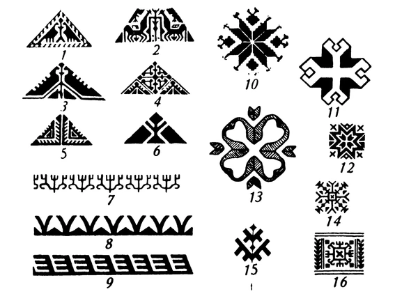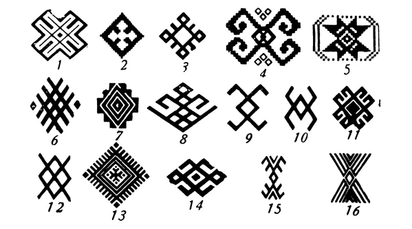 - Квадраты, ромбы, стилизованные изображения человека, восьмиконечной розетки, X-образной фигуры — используются в ткачестве, счетной и строчевой вышивке[1].