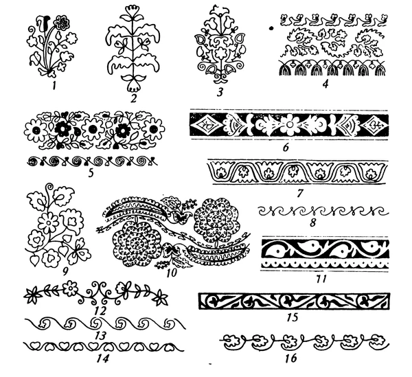 Для башкирского орнамента свойственны геометрические, криволинейно-растительные узоры. Обычно узоры наносились на дерево, кожу, металл, полотно.