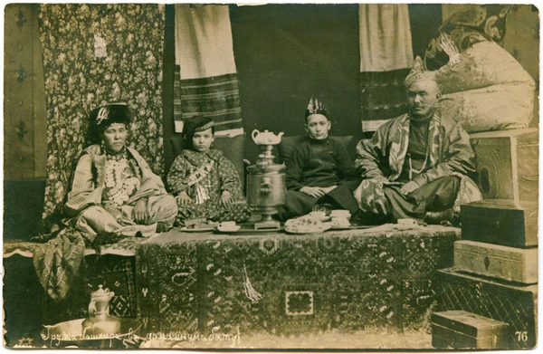 В мужской половине жилища размещались сундуки на деревянных подставках с паласами, кошмами, одеялами, подушками, тюфяками. На стенах развешивали праздничную одежду. На видном месте — седла, инкрустированная упряжь, лук в кожаном футляре и стрелы в колчане, сабля. На женской половине красовалась кухонная утварь.