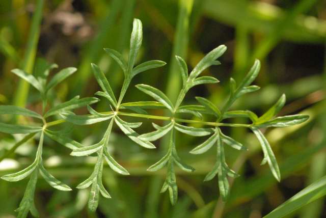 Листья перистые. Нижние, вместе с черешками, длиной 10—20 см, с яйцевидными или округло-яйцевидными, тупыми, крупно зубчатыми, коротко черешковыми или сидячими листочками, в числе трёх—пяти пар; конечный листочек часто трёхлопастной или трёхраздельный. Средние стеблевые листья немногочисленные с более глубоко рассечёнными на узкие доли листочками, при основании клиновидные, почти дважды перистые, сидячие на влагалищах. Верхние — с просто перистой или трёхраздельной мелкой пластинкой и ланцетовидными или почти линейными долями. Самые верхние листья с редуцированной пластинкой.