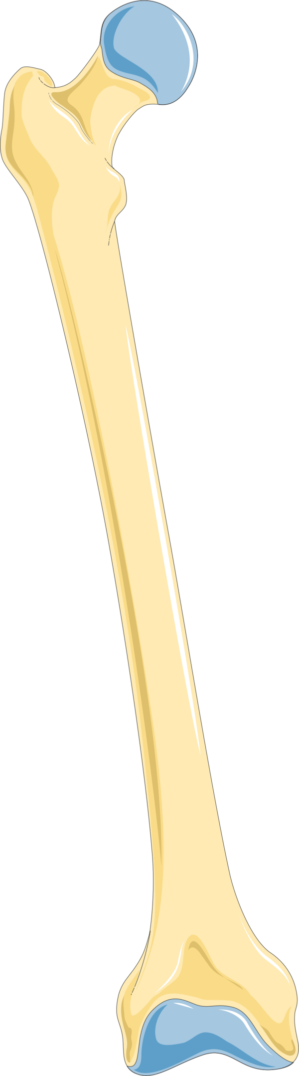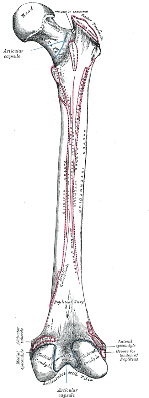 На проксимальном эпифизе находится головка бедренной кости, caput femoris, имеющая суставную поверхность, которая служит для сочленения с вертлужной впадиной. В середине поверхности головки имеется ямка. Головка соединяется с телом кости хорошо выраженной шейкой, collum femoris, ось которой по отношению к продольной оси тела бедренной кости располагается приблизительно под углом 130°. В том месте, где шейка переходит в тело, находятся два бугра: большой вертел и малый вертел. Первый выступает латерально, легко прощупывается под кожей; второй расположен снутри и сзади. Внутри от большого вертела, со стороны шейки бедра, находится вертельная ямка, fossa trochanterica. Оба вертела соединены спереди межвертельной линией, linea intertrochanterica, а сзади — хорошо выраженным межвертельным гребнем, crista intertrochanterica. Все эти выступы и ямки служат для прикрепления мышц.