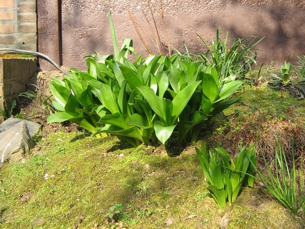 Листья в числе четырёх—пяти (реже трёх или шести), широко-продолговатые, на верхушке туповатые, длиной 18—25 см, шириной 3,5 см, нижние — более крупные, яйцевидные, шириной до 7 см, с длинным влагалищем, образующим ложный стебель.