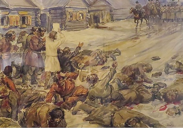 12 апреля в село вошли две роты Тарутинского полка под командованием генерал-майора графа А. С. Апраксина. Около дома Антона Петрова собралась толпа числом до 5000 человек. Апраксин потребовал выдать Петрова, но ему кричали: «Нам не нужно посланного от царя, но самого царя давай нам; стреляйте, но стрелять вы будете не в нас, а в Александра Николаевича». После этого по приказу Апраксина было произведено шесть залпов по безоружной толпе, в результате чего, по донесению Апраксина, было убито 51 человек и ранено 77 (по другим сведениям — 87; по сообщению лечившего раненых врача, общее число жертв превышало 350 человек). Только тогда толпа рассеялась, а Антон Петров вышел из дома, неся Положение о крестьянах над головою, и был арестован.
