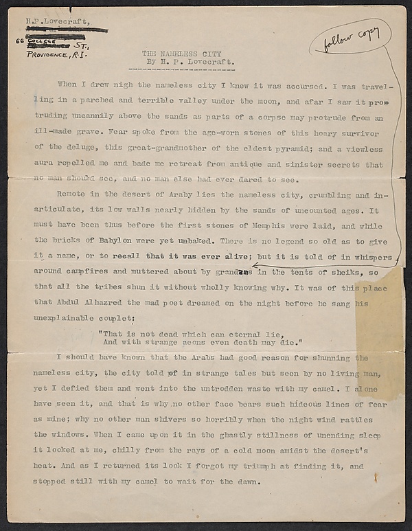 Далеко в Аравийской пустыне лежит Безымянный Город, полуразрушенный и безмолвный; его низкие стены почти полностью занесены песками тысячелетий. Этот город стоял здесь задолго до того, как были заложены первые камни Мемфиса и обожжены кирпичи, из которых воздвигли Вавилон. Нет ни одной легенды настолько древней, чтобы в ней упоминалось название этого города или те времена, когда он был ещё полон жизни. Приблизившись к безымянному городу, я сразу же ощутил тяготевшее над ним проклятие. В жуткой выжженной долине, залитой лунным светом, таинственно и зловеще выступает он из песков. Так высовываются части трупа из неглубокой, кое-как закиданной землею могилы. Ужасом веяло от источенных веками камней этого допотопного чуда, этого пращура самой старой из пирамид.Г. Ф. Лавкрафт. «Безымянный город» (1921).