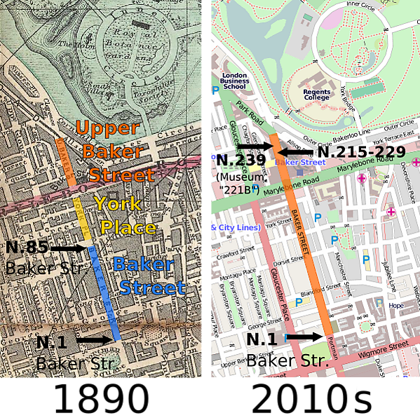 Наиболее известна в связи со знаменитым персонажем Артура Конан Дойла — частным детективом Шерлоком Холмсом. Согласно замыслу автора, великий сыщик жил на Бейкер-стрит в доме 221б, которого в реальности не существовало на момент написания произведений.