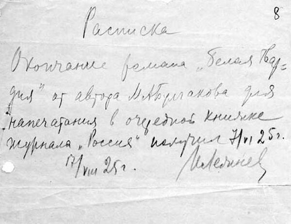 5 января 1925 года Булгаков написал в своем дневнике: «…у меня такое впечатление, что несколько лиц, читавших „Белую гвардию“ в „России“, разговаривают со мной иначе, как бы с некоторым боязливым косоватым почтением… окрепло у меня что-то в душе. Это состояние уже дня три. Ужасно будет жаль, если я заблуждаюсь и „Белая гвардия“ не сильная вещь»[19].