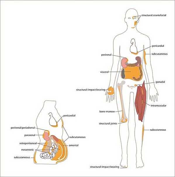 У взрослого человека белая жировая ткань располагается под кожей, особенно в нижней части брюшной стенки, на ягодицах и бёдрах (в составе подкожной ткани), вокруг внутренних органов (висцеральная жировая ткань), внутри костей (жёлтый костный мозг), между мышечными волокнами и в молочных железах. Бурая жировая ткань, выраженная у новорождённых детей и некоторых животных (грызунов и млекопитающих, впадающих в спячку), располагается на шее, около лопаток, за грудиной, вдоль позвоночника, под кожей и между мышцами[9]. У взрослого человека бурая ткань присутствует и метаболически активна[10][11], однако она регрессирует с возрастом[12].