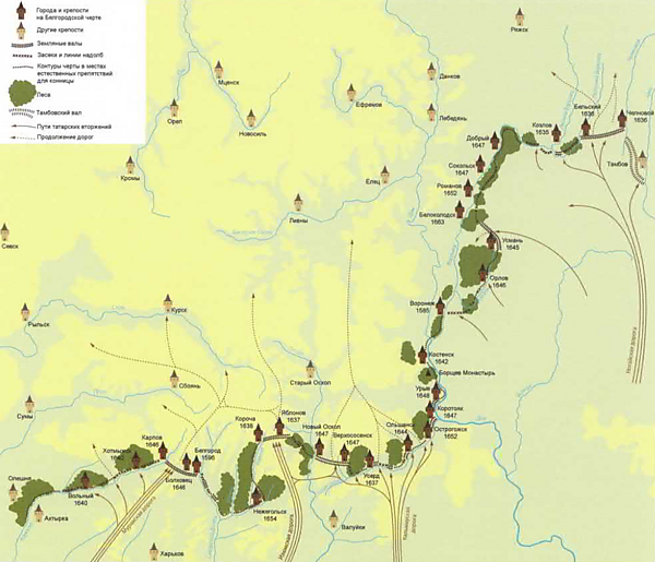 Южнее Белгородской черты были построены следующие крепости и остроги: