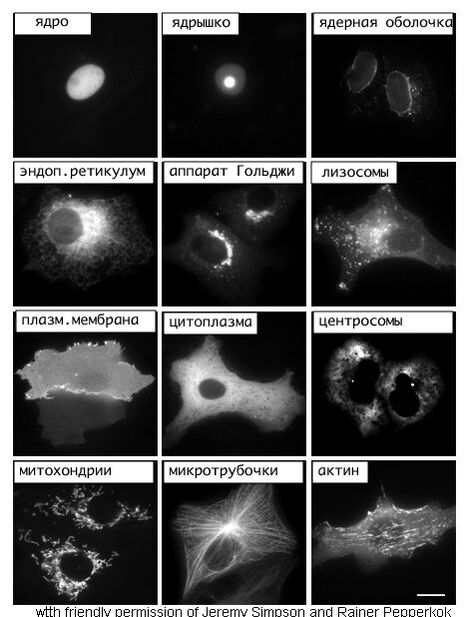 Методы молекулярной и клеточной биологии обычно применяются для изучения синтеза и локализации белков в клетке. Широко применяется метод изучения локализации, основанный на синтезе в клетке химерного белка, состоящего из исследуемого белка, соединённого с «репортёром», например, зелёным флуоресцентным белком (GFP)[87]. Расположение такого белка в клетке можно увидеть с помощью флуоресцентного микроскопа[88]. Кроме того, белки можно визуализировать с помощью распознающих их антител, которые в свою очередь несут флуоресцентную метку. Часто одновременно с изучаемым белком визуализируют известные белки таких органелл, как эндоплазматический ретикулум, аппарат Гольджи, лизосомы и вакуоли, что позволяет более точно определить локализацию изучаемого белка[89].