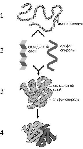 К. Линдстрём-Ланг предложил выделять 4 уровня структурной организации белков: первичную, вторичную, третичную и четвертичную структуры. Хотя такое деление несколько устарело, им продолжают пользоваться[4]. Первичная структура (последовательность аминокислотных остатков) полипептида определяется структурой его гена и генетическим кодом, а структуры более высоких порядков формируются в процессе сворачивания белка[23]. Хотя пространственная структура белка в целом определяется его аминокислотной последовательностью, она является довольно лабильной и может зависеть от внешних условий, поэтому более правильно говорить о предпочтительной или наиболее энергетически выгодной конформации белка[4].