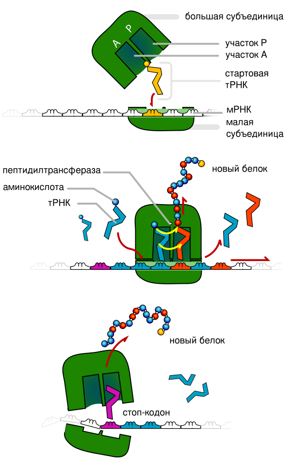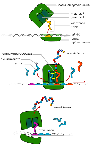 Во время начальной стадии трансляции, инициации, инициаторный (обычно метиониновый) кодон узнаётся малой субъединицей рибосомы, к которой при помощи белковых факторов инициации присоединена аминоацилированная метиониновая тРНК. После узнавания стартового кодона к малой субъединице рибосомы присоединяется большая субъединица, и начинается вторая стадия трансляции — элонгация. При каждом шаге рибосомы от 5'- к 3'-концу мРНК считывается один кодон путём образования водородных связей между ним и комплементарным ему антикодоном транспортной РНК, к которой присоединён соответствующий аминокислотный остаток. Образование пептидной связи между последним аминокислотным остатком растущего пептида и аминокислотным остатком, присоединённым к тРНК, катализируется рибосомальной РНК (рРНК), образующей пептидилтрансферазный центр рибосомы. Этот центр позиционирует атомы азота и углерода в положении, благоприятном для прохождения реакции. Третья и последняя стадия трансляции, терминация, происходит при достижении рибосомой стоп-кодона, после чего белковые факторы терминации гидролизуют связь между последней тРНК и полипептидной цепью, прекращая её синтез. В рибосомах белки всегда синтезируются от N- к C-концу[39].