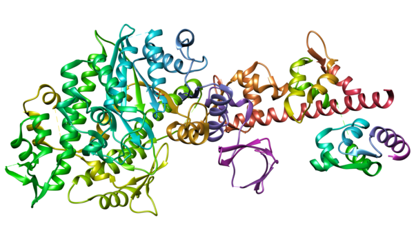 Гены, кодирующие белки, сначала транскрибируются в последовательность нуклеотидов матричной РНК (мРНК) ферментами РНК-полимеразами. В подавляющем большинстве случаев белки живых организмов синтезируются на рибосомах — многокомпонентных молекулярных машинах, присутствующих в цитоплазме клеток. Процесс синтеза полипептидной цепи рибосомой на матрице мРНК называется трансляцией[39].