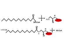 Белки, ацилированные жирными кислотами, — это белки, которые подверглись посттрансляционным модификациям и стали ковалентно связанными с жирными кислотами по некоторым аминокислотным остаткам[10][11]. К числу жирных кислот, наиболее часто связанных с белками, относят насыщенную 14-углеродную миристиновую кислоту и 16-углеродную пальмитиновую кислоту. Белки могут быть связаны как с одной из этих жирных кислот, так и с двумя[10].