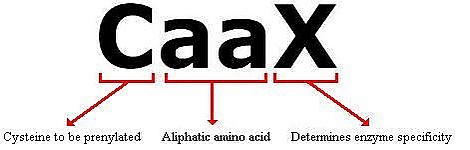 Мотив пренилирования, известный как CAAX-бокс — наиболее популярный сайт пренилирования белков, то есть сайт, к которому ковалентно прикрепляются фарнезил или геранилгеранил[2][3]. В CAAX-боксе С — это пренилируемый остаток цистеина, А — алифатический аминокислотный остаток и Х определяет, какой тип пренилирования будет иметь место. Если Х — это Ala, Met, Ser или Gln, то белок будет фарнезилирован при помощи фермента фарнезилтрансферазы, а если Х — это Leu, то белок будет геранилгеранилирован ферментом геранилгеранилтрансферазой I[3][4]. Эти ферменты схожи и оба состоят из двух субъединиц[6].