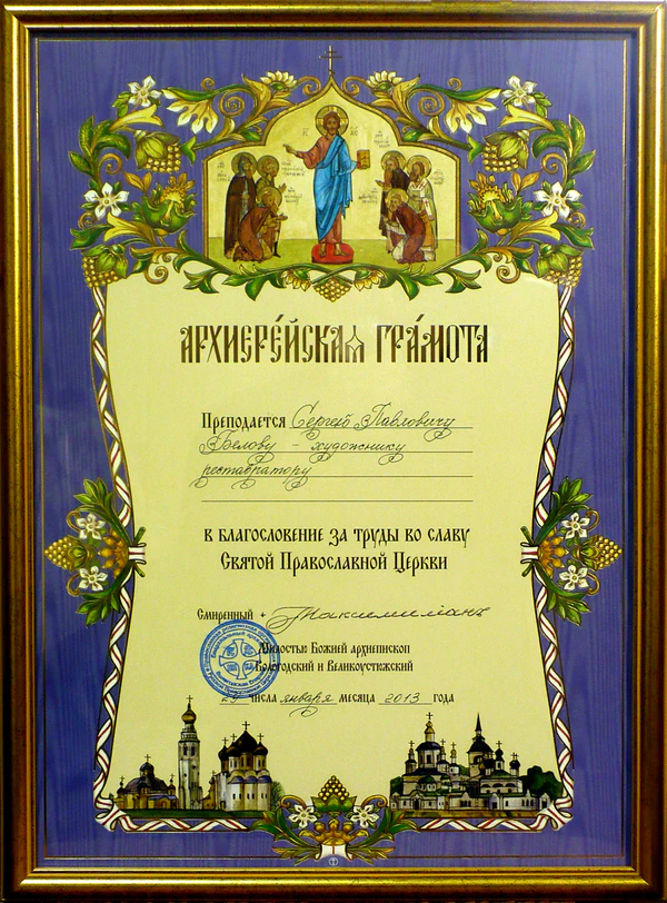 - Архиерейская грамота РПЦ «В Благословение за труды во славу Святой Православной церкви» за подписью Архиепископа Вологодского и Великоустюжского Максимилиана (январь 2013 года).