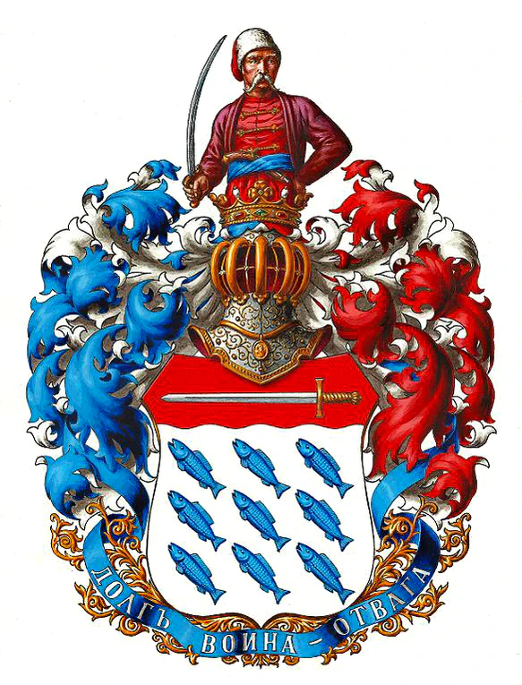 В серебряном волнообразно пересечённом щите девять лазоревых рыб, плывущих диагонально в три ряда. В червлёной главе щита серебряный с золотой рукоятью тесак.