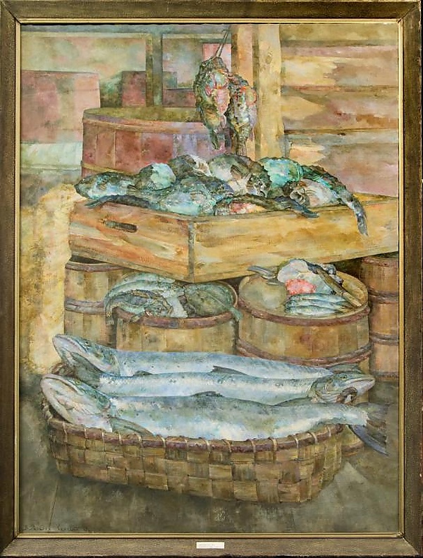 На переднем плане композиции изображены две большие голубоватые рыбы, лежащие в плетёной корзинке. За корзинкой расположены несколько бочек, две из которых наполнены мелкой рыбой. Справа на одной из бочек находятся нож, кусок рыбы и икра. На бочке также размещён открытый ящик, заполненный рыбами с зеленовато-красной чешуёй. Над большой бочкой у стены на столбе подвешены две крупные рыбы. В глубине картины видна открытая дверь, что придаёт сцене дополнительную глубину.