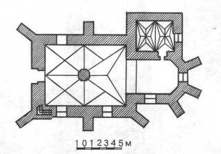 Церковь Святителя Николая (вторая половина 1510-х — начало 1520-х гг.) — первоначально (до перестроек середины XVIII — XX вв.) трёхнефное, трёхпрясловое, зальное сооружение с трёхчастным полукруглым алтарём и квадратной в плане башней-колокольней, прилегающей к юго-западному углу, перекрытое остроконечной кровлей, на коньке которой размещалась деревянная главка[18][2].