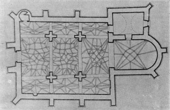 Внутри пространство основного объёма разделено на три нефа, из которых боковые вдвое уже центрального, но равны ему по высоте. Все травеи, перекрыты крестовыми с нервюрами сводами[9].