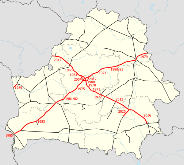 - 2017: Молодечно — Гудогай — госграница Литва[14] (далее участок до Науйойи-Вильня электрифицирован LG). Обход Минска: Колодищи — Шабаны[15];