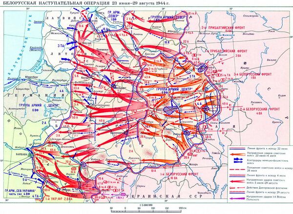 В ходе этого обширного наступления была освобождена территория Белоруссии, восточной Польши, часть Прибалтики и практически полностью разгромлена германская группа армий «Центр». Вермахт понёс тяжелейшие потери, отчасти из-за того, что А. Гитлер многократно запрещал отступление, не соглашаясь с предложениями своих генералов[89]. Восполнить эти потери впоследствии Германия была уже не в состоянии.