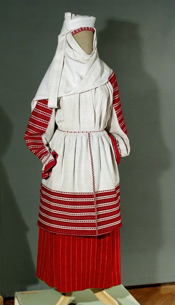 До XIII в. для украшения женской одежды использовали металлические платины, проволоку, спиральки. Они нашивались на ткань или просто втыкались в неё. Также использовалось украшение нашивкой с использованием металлической нитки[83]. Начиная с XIII в. металлические нашивки на одежде были постепенно заменены на вышивку с использованием красных и чёрных ниток, ставшей самым популярным и основным способом украшения тканой одежды. Вышивка делалась двумя способами — «гладью» и «в прикреп».