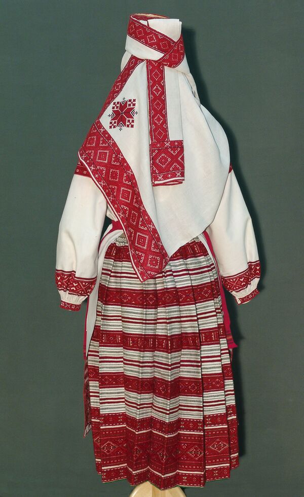Важным аксессуаром сельского праздничного костюма в XIX — начале XX в. служил разрезанный по диагонали кусок покупной ткани, использовавшейся в качестве шейного платка. Шейный платок обычно носили в комплексе с сорочкой с отложным воротником в праздники или на ярмарки, в гостях, храме[82].