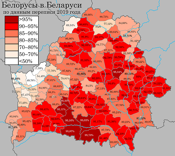 По данным переписи населения Белоруссии 2009 года, родным белорусский язык указали 4 841 319 белорусов (60,84 %). Кроме того, 1 009 935 (12,69 %) белорусов указали белорусский как второй язык, которым они свободно владеют. Таким образом, в Белоруссии в 2009 году 5 851 254 (73,53 %) белоруса заявили о свободном владении белорусским языком. Тем не менее лишь 2 073 853 (26,06 %) белоруса заявили, что обычно говорят по-белорусски дома[32]. По сравнению с 1999 годом эти цифры отражают тенденцию снижения использования белорусского языка; по результатам предыдущей переписи, белорусский считали своим родным 85,6 % белорусов, а дома на нём общались 41,3 %[33].