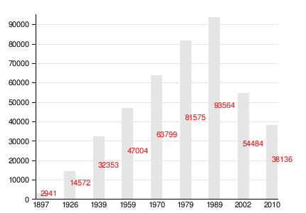 | 1897[3] | 1926[4] | 1939[5] | 1959[6] | 1970[7] | 1979[8] | 1989[9] | 2002[10] | 2010[1][2] |