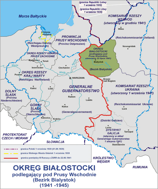 Нацистская Германия планировала включить эти земли в свой состав, опираясь на исторические претензии Пруссии, вытекающие из условий, установленных договорами между Пруссией, Россией и Австрийской империей согласно третьему разделу Польши, которая передала Белосток Пруссии. С 1795 по 1806 г. данная территория входила в состав Новой Восточной Пруссии.