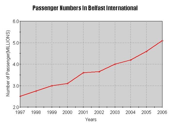 - Рост пассажирооборота: Международный аэропорт Белфаста обслужил 5,015,000 пассажиров в 2006 году[2], что является самым высоким показателем в Северной Ирландии. Аэропорт показывает положительную динамику роста пассажирооборота, взлётов и посадок и грузооборота в течение последних 10 лет.