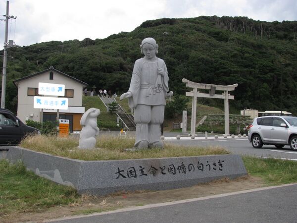 Согласно истории, рассказанной в «Кодзики», Белый заяц жил на острове Оки. Однажды он решил покинуть свой остров. Для этого он сказал морскому крокодилу Вани, что хочет сравнить, у кого из них родичей больше. Для подсчета крокодилов, Заяц предложил им выстроиться в ряд. Прыгая по ним, Заяц одновременно пересчитал рептилий и перебрался на другой берег. В момент, когда Заяц спрыгивал с последнего крокодила, он признался в обмане. За это разозленный крокодил укусил Зайца и содрал с него всю одежду. После этого оставшемуся голым Зайцу повстречались братья бога Окунинуси, идущие свататься к красавице Ягамихимэ. Они научили Зайца, что ему следует окунуться в морскую воду и лечь на высокую скалу. Когда Заяц последовал их совету, соль из моря высохла и кожа Зайца потрескалась. Идущий следом за братьями Окунинуси в свою очередь научил Зайца, как ему исцелиться. В благодарность Заяц сделал так, что Ягамихимэ отвергла братьев и выбрала Окунинуси[1].