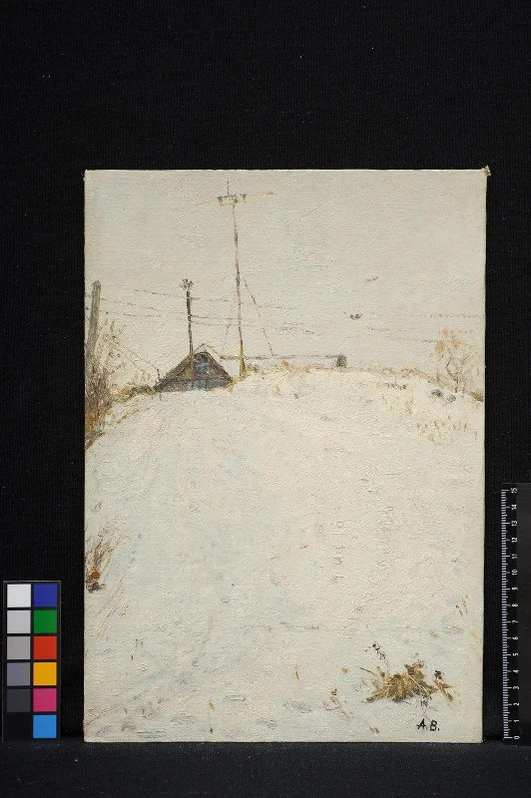 На картине представлен вид снизу на высокий заснежённый холм, на вершине которого видна крыша дома. Через композицию проходит линия электропередач, выделяющаяся на фоне серого неба. Сочетание природного пейзажа с элементами современной инфраструктуры подчёркивает контраст между природой и деятельностью человека.