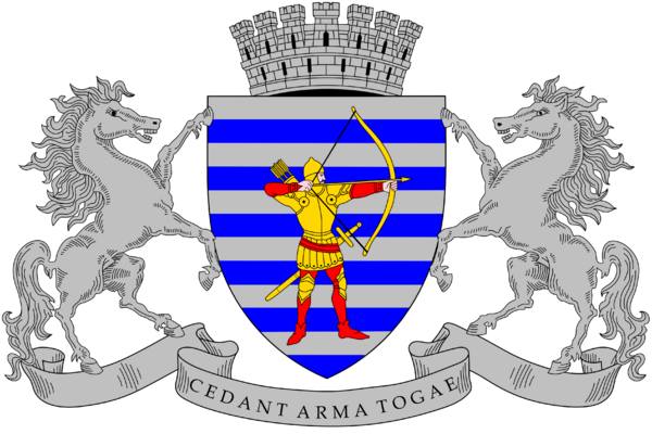 Основной элемент герба — щит, на который нанесены двенадцать чередующихся горизонтальных полос серебряного и синего цвета. Серебряный цвет символизирует воду, синий — землю. Сочетание этих цветов символизирует румынское название города, буквально означающее «болота» (то есть вода и земля).[13]
