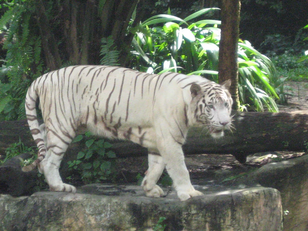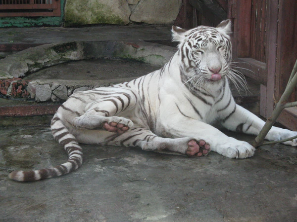 Небольшая популяция была выведена зарубежными учёными в середине 70-х для украшения зоопарков. В природных условиях белая шкура только мешала бы зверю охотиться летом. Специалисты объясняют редкий окрас недостаточным содержанием пигмента. Однако чёрные полоски при этом не пострадали. Белые тигры отличаются от своих собратьев с рыжей шкурой ещё и голубым цветом глаз (это доказывает, что данная мутация не является альбинизмом).
