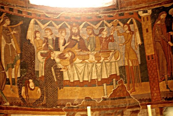 Апсиды и восточная стена были заново расписаны в XII веке романскими фресками на различные библейские темы: празднование дня рождения Ирода Антипы (включая танец дочери Иродиады, повлёкший за собой казнь Иоанна Крестителя), притчу о десяти девах, лики апостолов и Святого Стефана[2].