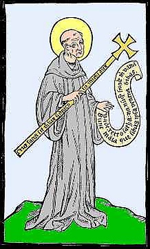 | Атрибуты | Устав, жезл аббата, пучок розг, треснувший кубок или кубок со змеёй (указание на попытку отравления), ворон с куском хлеба в клюве |