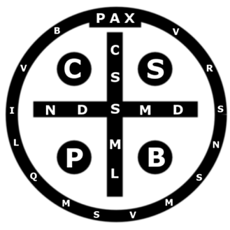Эта религиозная медаль изначально произошла от креста в честь святого Бенедикта. На одной стороне медали изображен Святой Бенедикт, держащий Священное Правило в левой руке и крест в правой. С одной стороны от него ворон, с другой — чаша. На внешнем поле медали есть слова «Да укрепит нас его присутствие в час нашей смерти» (лат. Eius in obitu nostro praesentia muniamur). На другой стороне медали есть крест с инициалами CSSML на вертикальной полосе, означающий «Да будет Святой Крест моим светом» (лат. Crux Sacra Sit Mihi Lux), а на горизонтальной полосе — инициалы NDSMD, которые обозначают «Да не будет змий мне князем» (лат. Non Draco Sit Mihi Dux). Инициалы CSPB обозначают «Крест Святого Отца Бенедикта» (лат. Crux Sancti Patris Benedicti) и расположены на внутренних углах креста. В большинстве случаев вверху креста можно найти надпись «PAX» (мир) или христограмму «IHS». На краю медали с этой стороны расположены инициалы Vade retro, Satana VRSNSMV, которые означают «Отойди от меня, сатана, не не искушай меня своим тщеславием» (лат. Vade Retro Satana, Nonquam Suade Mihi Vana), затем пробел, за которым следует инициалы SMQLIVB, которые означает «Зло есть то, что ты предлагаешь, выпей этот яд сам» (лат. Sunt Mala Quae Libas, Ipse Venena Bibas)[12].