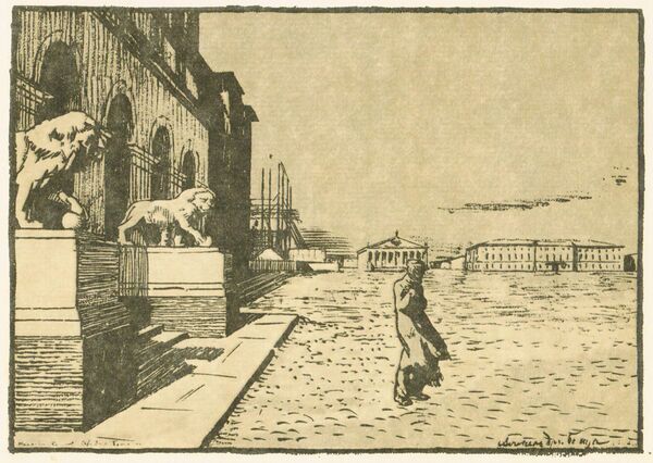 В 1903 году Бенуа создал один из шедевров российской книжной графики — серию иллюстраций к поэме А. С. Пушкина «Медный всадник». Однако они были отвергнуты как «декадентские». Иллюстрации приобрёл С. П. Дягилев и напечатал их вместе с поэмой в журнале «Мир искусства» (1904. № 1). Рисунки Бенуа «произвели фурор и были признаны всеми знатоками книги как идеальная графическая работа»[5]. В 1905 году художник продолжил работу над иллюстрациями — для издания, выпущенного в 1912 году Санкт-Петербургским обществом грамотности, а затем и в 1916 году — для Общины Святой Евгении. В 1917-м книгу набрали в типографии Р. Р. Голике и А. И. Вильборга, но предприятие это было национализировано, и книга увидела свет только в 1923 году — под маркой Комитета популяризации художественных изданий. Печаталась она в Государственной типографии имени Ивана Фёдорова под наблюдением её директора В. И. Анисимова и при содействии Петроградского отделения Госиздата. В книгу вошло 37 рисунков Бенуа.[6].
