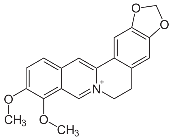 Берберин (ранее также ямаицин и ксантопикрит) — алкалоид состава C20H17NO4, содержится в различных частях многих растений, принадлежащих к разнообразнейшим семействам, так что с этой стороны может считаться одним из распространенных в растительном царстве. Кроме барбариса (Berberis vulgaris), он найден в корнях коломба (Radix Colombo), принадлежащем растению Cocculus palmatus Dec., в коре Geoffroya inermis и Xanthoxylum clava Herculis (откуда его прежние названия ямаицин и ксантопикрит) и т. д. В настоящее время его получают из корней культивируемого лекарственного растения Coptis chinensis.[1]