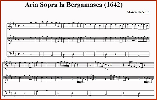 Как правило, в каждой итальянской провинции есть (или был) свой самобытный, уникальный танец, — своеобразная визитная карточка местности и проживающего там населения. В провинции Бергамо в XVI-XVII веках такую функцию выполняла бергамаска — оживлённый и очень энергичный танец, часто сопровождаемый мелодией весёлого и энергичного характера.[2] Музыка танца — чёткая, ритмичная, в четырёхдольном размере, с чётким разделением на восьмитактовые периоды и неизменным повторением гармонической последовательности I – IV – V – I, часто служившей основой для вариаций (или импровизаций) на basso ostinato.[4]