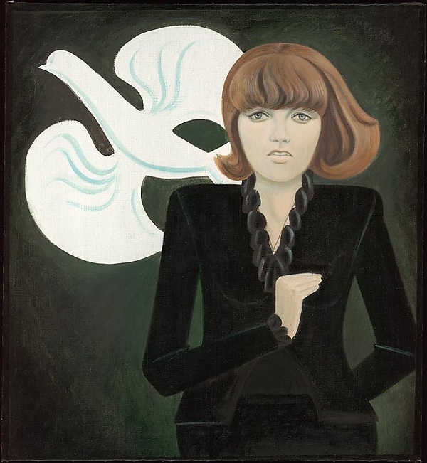 На полотне в фас изображена молодая девушка в чёрном костюме на тёмно-зелёном фоне. Правая рука фигуры прижата к груди, левая убрана за спину, а взгляд обращён к зрителю. Позади изображена стилизованная белая птица, что придаёт работе черты символизма. Картина посвящена памяти Евгении Коваленко — журналиста и художника.