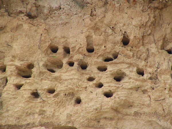 Со стороны многочисленные норы создают впечатление многоэтажных домов с рядами окон. Расстояние между соседними гнёздами небольшое, но может варьировать в небольших пределах. Например, исследования на территории США показали средний результат 12,7—17,8 см[17]. Гнездо устраивается в дальнем, расширенном конце норы и представляет собой несколько слоёв травы, соломинок, перьев других птиц или стебельков растений[8][18]. Диаметр гнезда в центре составляет около 2,5 см, но ближе к краям оно становится тоньше[19].