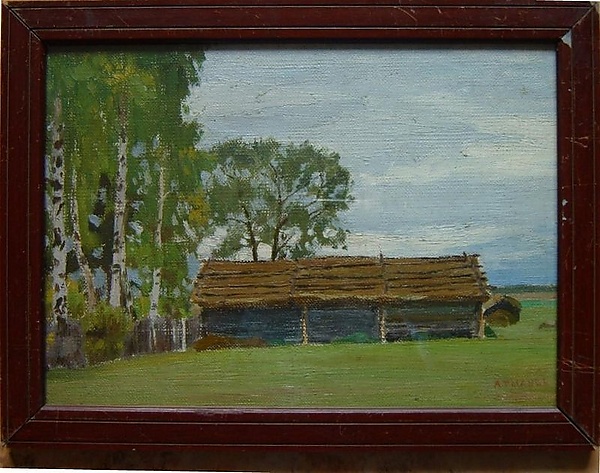 На картине представлен пейзаж средней полосы России с характерными для региона мотивами. В центре композиции изображён деревянный сарай фиолетово-коричневого цвета, слева за деревянным забором располагается группа берёз. За сараем виднеется дерево, а справа можно увидеть стог сена и лес на горизонте. Работа выполнена в зелёно-голубой цветовой гамме.